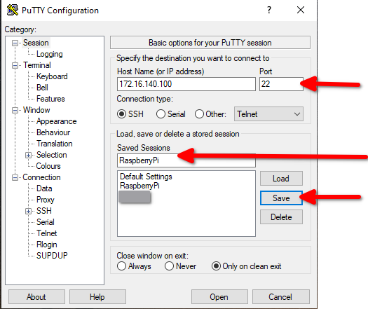 Wir legen nun als erstes in PuTTY ein Verbindungsprofil für deinen Raspberry Pi an: Dazu gibst du die dir bekannte IP Adresse deines Raspberry Pi an, benennst das anzulegende Profil (z.B. „RaspberryPi“), gibst die zutreffende IP Adresse an (hier 172.16.140.100) und stellst den korrekten Port ein (i.d.R. „22“). Du bestätigst mit „Save“. Es sollte jetzt das Verbindungsprofil „RaspberryPi“ vorhanden sein. Mit diesem kannst du zukünftig per einfachem Doppelklick auf den Profilnamen die Verbindung per SSH herstellen.