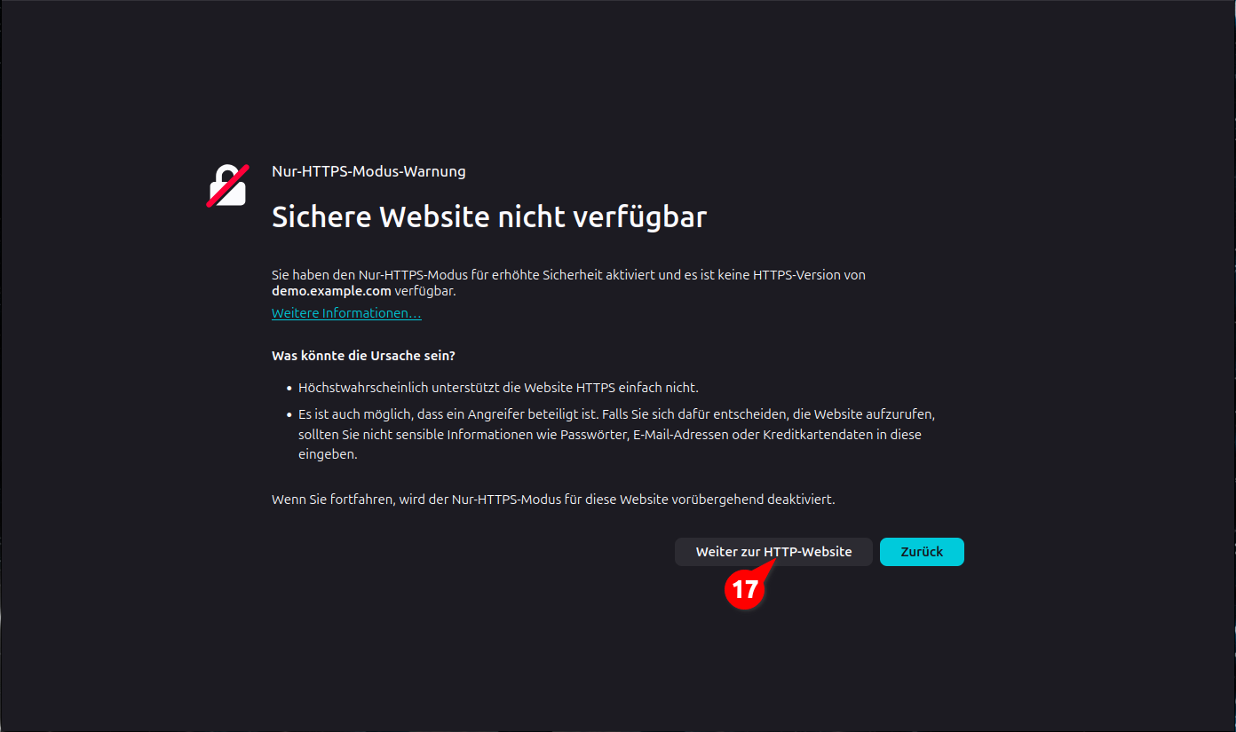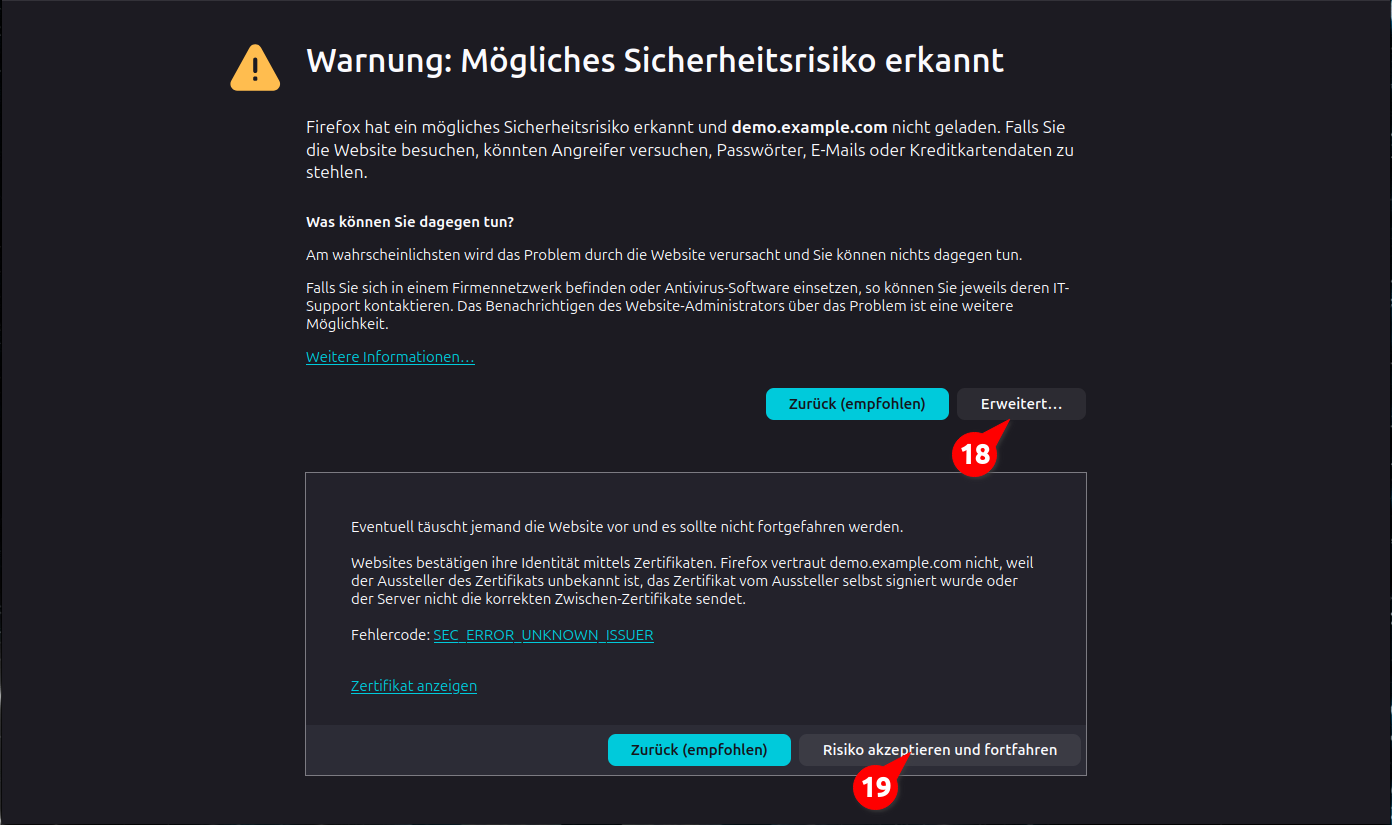 9) Ruft man die Webseite "demo.example.com" jetzt auf bekommt man im Fall von http und einem aktiven Nur-HTTPS-Modus eine Warnung die man über "Weiter" [17] übergehen kann. Ruft man die Seite via "https://demo.example.com" auf bekommt man eine Sicherheitswarnung (weil der Namen des Standard-Zertifikats der Synology nicht zum eigenen Portalnamen / Domainnamen passt). Diese kann man über "Erweitert" [18] und "Risiko akzeptieren und fortfahren" [19] normal ebenfalls überstimmen. In beiden Fällen müsste man dann in einen Fehler 403 laufen, weil im Dokument-Root für den Dienst noch keinerlei Daten hinterlegt sind die ausgeliefert werden könnten.