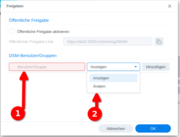 Im „Freigeben“ Fenster gibst du zunächst die Benutzer*innen an, für welche du das Notizbuch freigeben möchtest (1) und bestimmst dann, ob diese, das Notizbuch nur angezeigt bekommen dürfen oder auch selber Einträge bearbeiten, also „ändern“ dürfen (2).