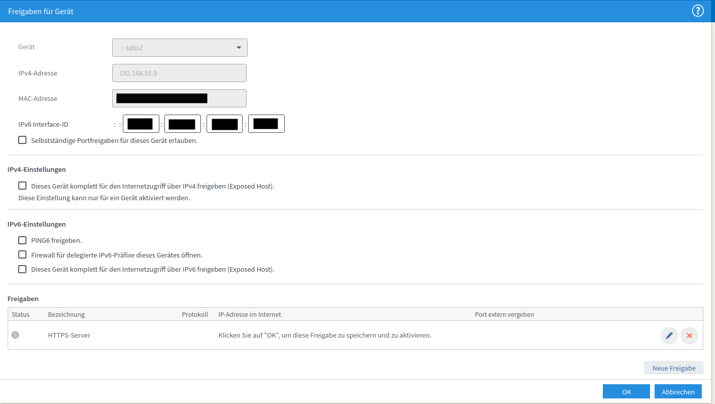 Das war alles, du hast jetzt eine Portfreigabe auf deiner Fritzbox für das Gerät tabs2 angelegt um den HTTPS-Server Dienst auf diesem Gerät aus dem Internet über IPv4 und IPv6 erreichen zu können. Die Fritzbox blockiert nicht länger diesbezügliche Anfragen aus dem Internet.